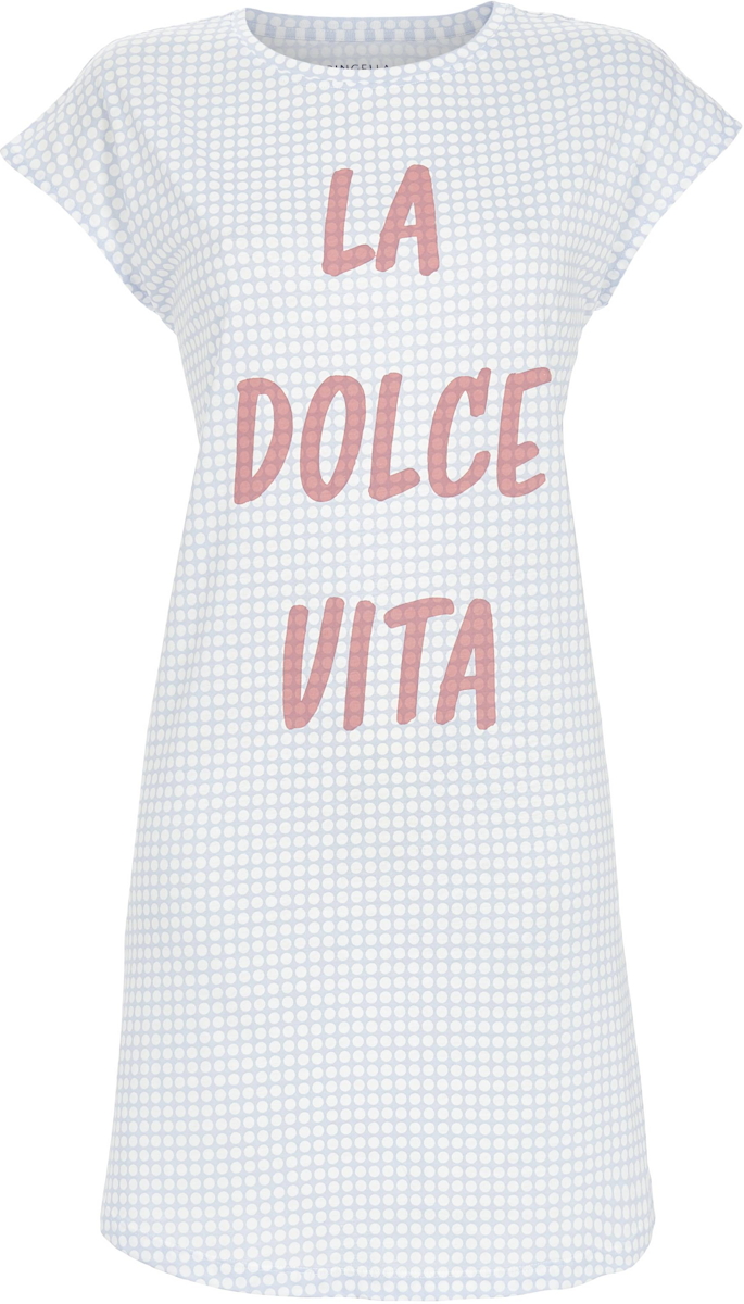 Een leuk nachthemd van het merk Ringella. Het nachthemd heeft korte mouwen en een ronde hals. Op het voorpand staat in framboosroze letters de Italiaanse spreuk – La Dolce Vita’. Verder heeft het nachthemd een patroon van speelse witte stippen op de blauwe achtergrond.