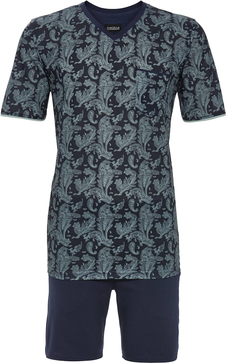 Een mooie heren shortama van het merk Ringella. Het shortamashirt heeft korte mouwen en een V-hals. De mouwuiteinden zijn afgewerkt met een turquoise bies. Verder heeft het shirt een uniek turquoise paisleypatroon op de marineblauwe achtergrond. De korte broek beschikt over praktische zakken en is effen marineblauw van kleur.