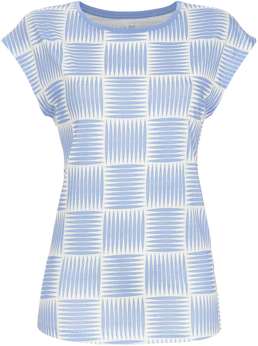 Een speels pyjamashirt van Ringella uit de Bloomy collectie. Het shirt heeft korte mouwen en een ronde hals. De stof heeft een grafisch patroon van groepen zwembadblauwe streepjes op de crèmekleurige achtergrond.
