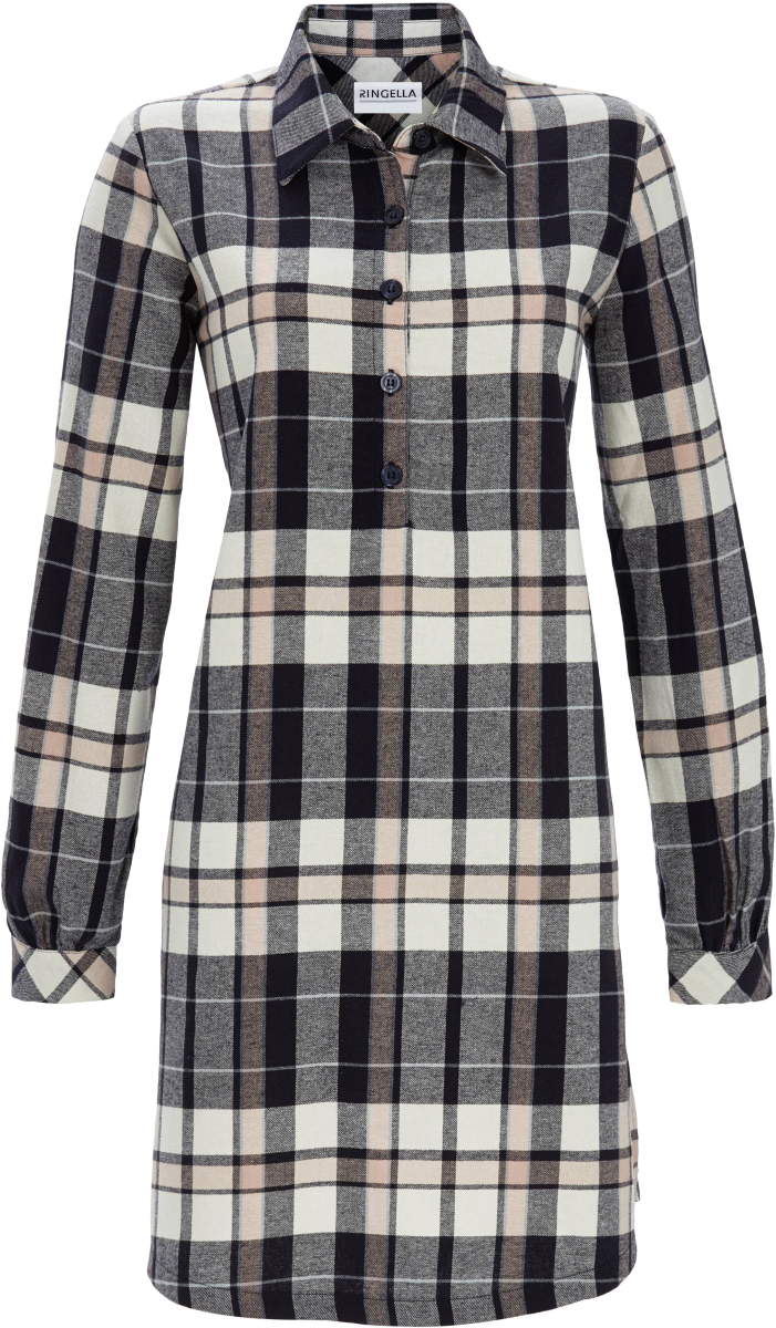 Een flanellen nachthemd van het merk Ringella. Het nachthemd heeft lange mouwen met manchetten en een opstaande kraag met knoopsluiting. Verder heeft de stof een leuke ruitenprint in verschillende tinten grijs, wit en lichtroze.