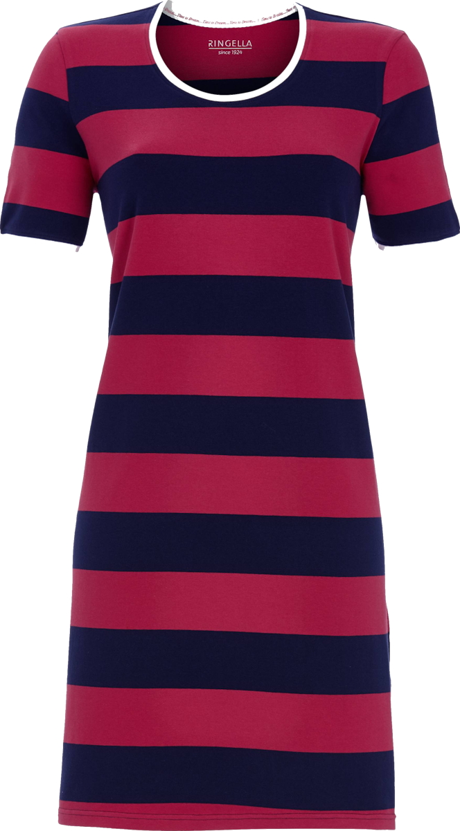Een gestreept nachthemd van het merk Ringella. Het nachthemd heeft korte mouwen en een ronde hals. De hals en mouwuiteinden zijn afgewerkt met een witte bies. Verder heeft het nachthemd een breed strepenpatroon in de kleuren robijnrood en marineblauw.