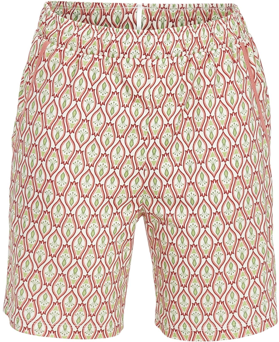 Een korte pyjamabroek van Ringella uit de Bloomy collectie. De korte broek heeft een elastische tailleband en beschikt over praktische zakken. De stof heeft een leuke grafische print in lichtrood en limoengroen op de crèmekleurige achtergrond.