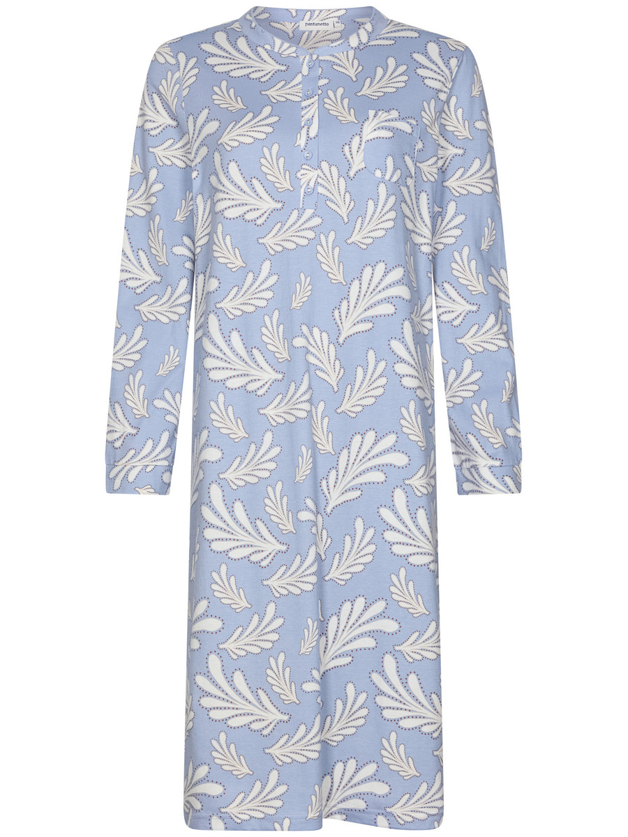 Een katoenen nachthemd van het merk Pastunette. Het nachthemd heeft lange mouwen en een ronde hals met knoopsluiting. De mouwuiteinden zijn gedecoreerd met kleine splitjes. De stof heeft een mooie witte floraprint op de ijsblauwe achtergrond.
