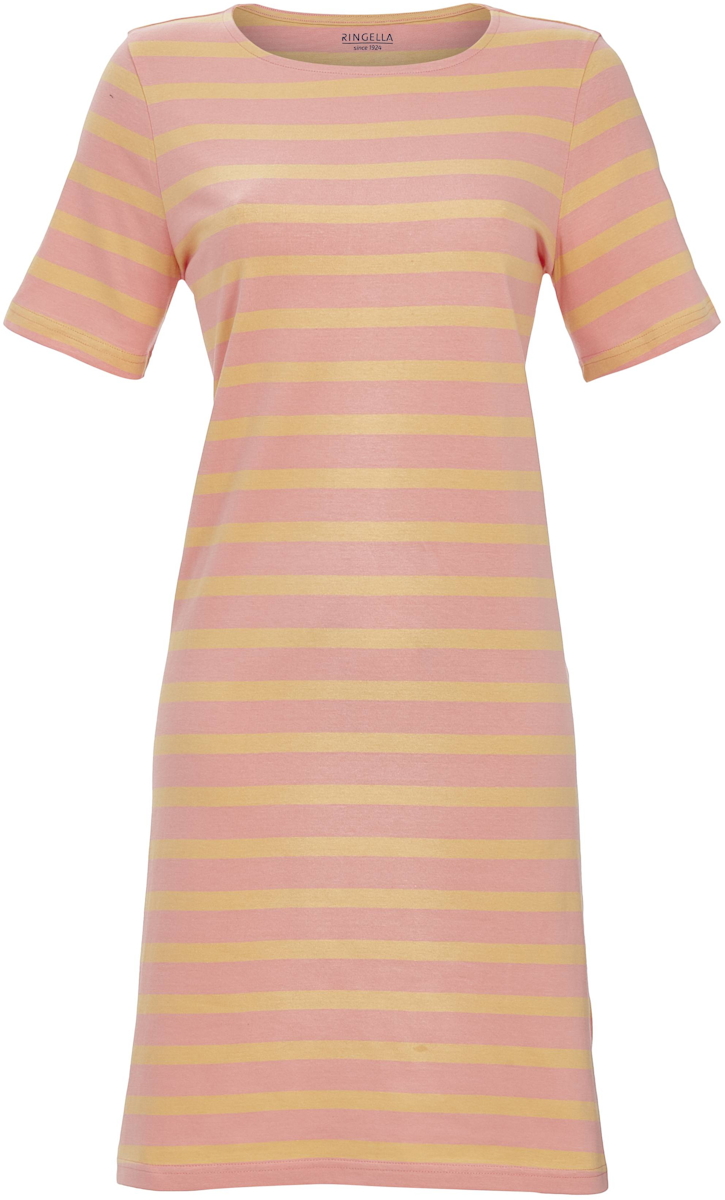 Een katoenen nachthemd van het merk Ringella. Het nachthemd heeft korte mouwen en een ronde hals. De stof heeft een leuk strepenpatroon in de kleuren helder campariroze en lichtoranje.