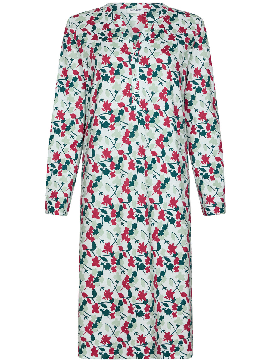 Een katoenen nachthemd van het merk Pastunette. Het nachthemd heeft lange mouwen en een splithals met knoopsluiting. De stof heeft een leuke bloemenprint in de kleuren framboosrood, petrol-blauw/groen en lichtgroen met lichtgrijs op de witte achtergrond.