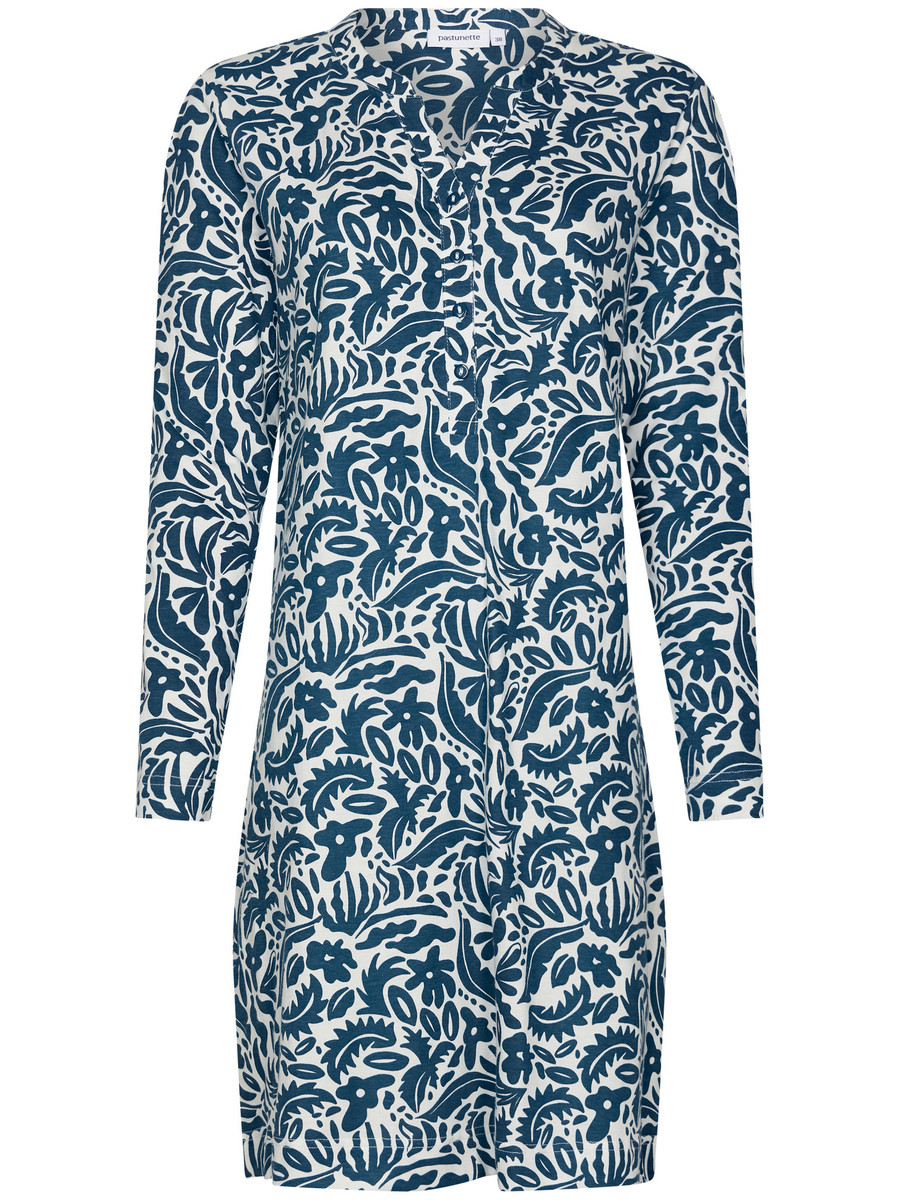 Een duurzaam katoenen nachthemd van het merk Pastunette. Het nachthemd heeft lange mouwen en een splithals met knoopsluiting. De stof heeft een marineblauwe organische floraprint op de witte achtergrond. Het nachthemd is gemaakt van organisch katoen.