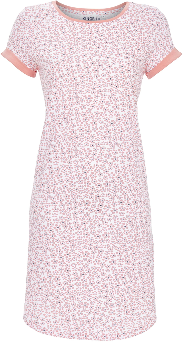 Een katoenen nachthemd van het merk Ringella. Het nachthemd heeft korte mouwen en een ronde hals. De hals en mouwuiteinden zijn afgewerkt met een brede framboosroze bies. Verder heeft de stof een mooie print van framboosroze bloemetjes op een witte achtergrond.