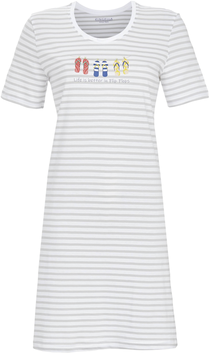 Een zomers katoenen nachthemd van het merk Ringella. Het nachthemd heeft korte mouwen en een ronde hals. Op het voorpand staat een leuke print van drie kleurrijke verschillende slippers met daaronder de tekst – life is better in flip flops – in blauwe letters. Verder heeft het nachthemd een strepenpatroon in de kleuren zilverblauw en wit.