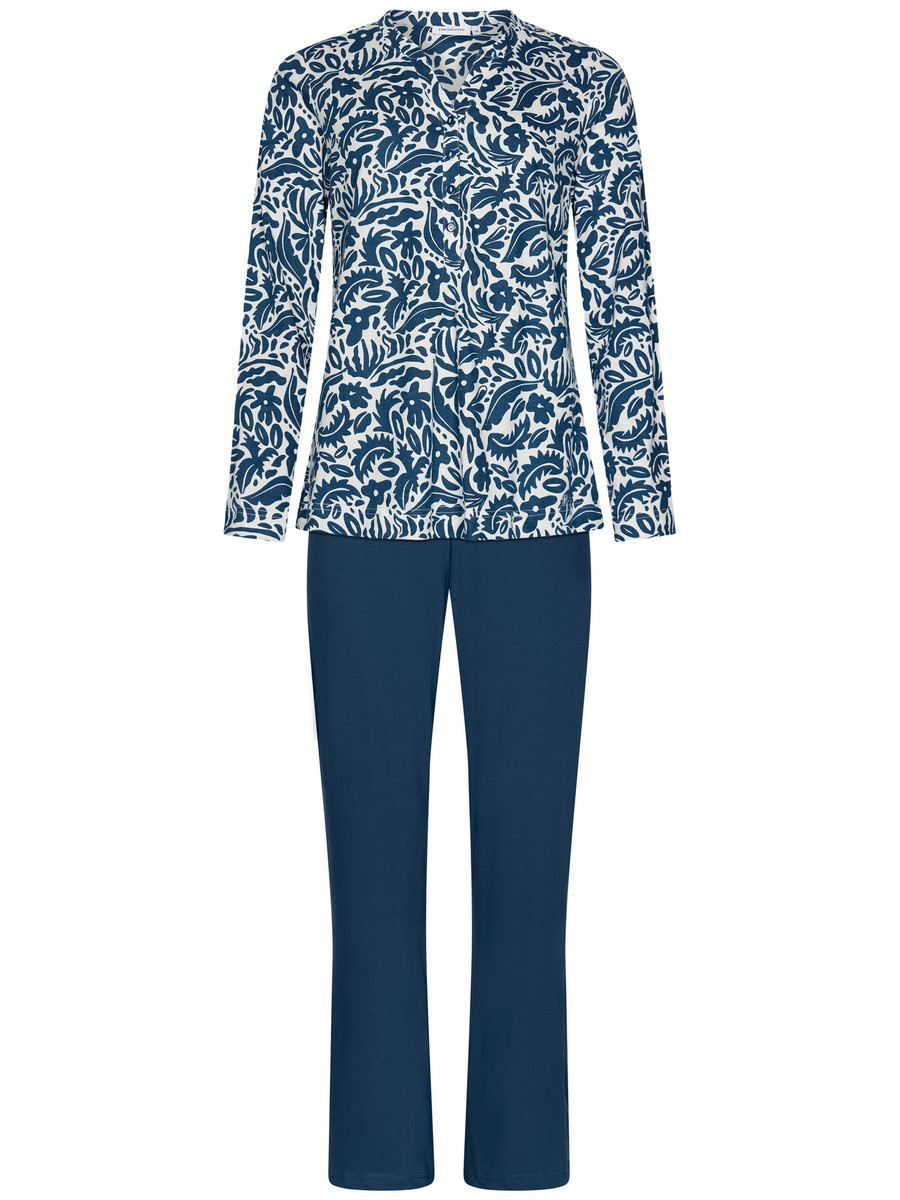Een duurzame katoenen pyjama van het merk Pastunette. Het pyjamashirt heeft lange mouwen en een splithals met knoopsluiting. De stof heeft een marineblauwe organische floraprint op de witte achtergrond. De lange broek is effen marineblauw van kleur. De pyjama is gemaakt van organisch katoen.