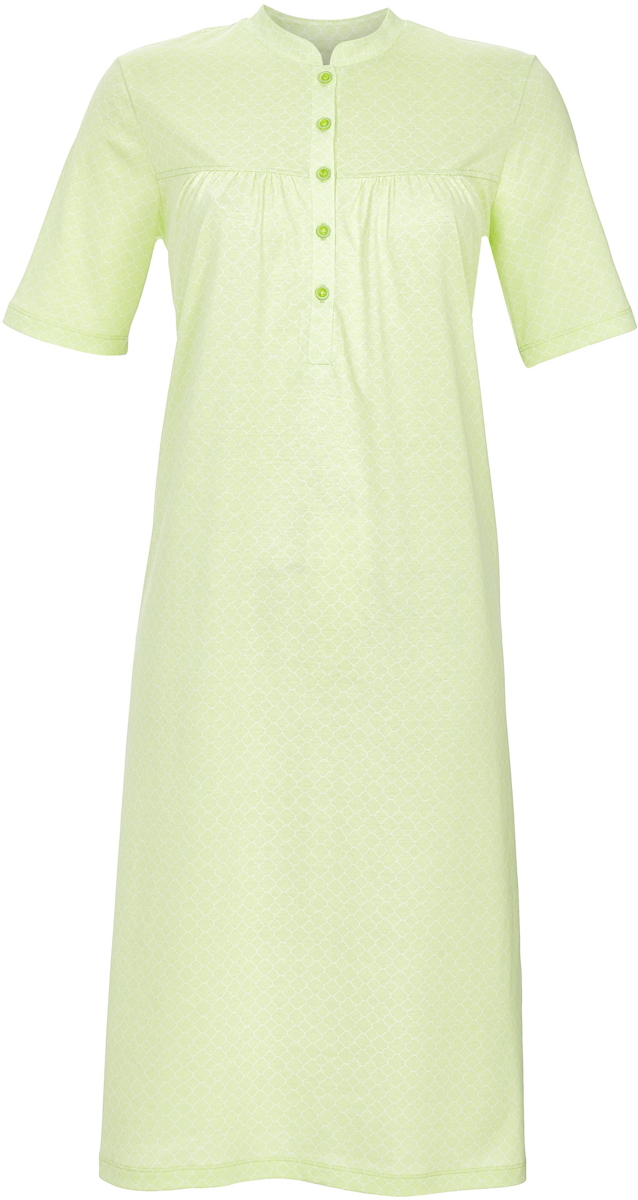 Een klassiek nachthemd van het merk Ringella. Het nachthemd heeft korte mouwen en een hoge hals met knoopsluiting. De stof heeft is geplooid op de borst. Verder heeft het nachthemd een subtiel grafisch patroon op de limoengroene achtergrond.