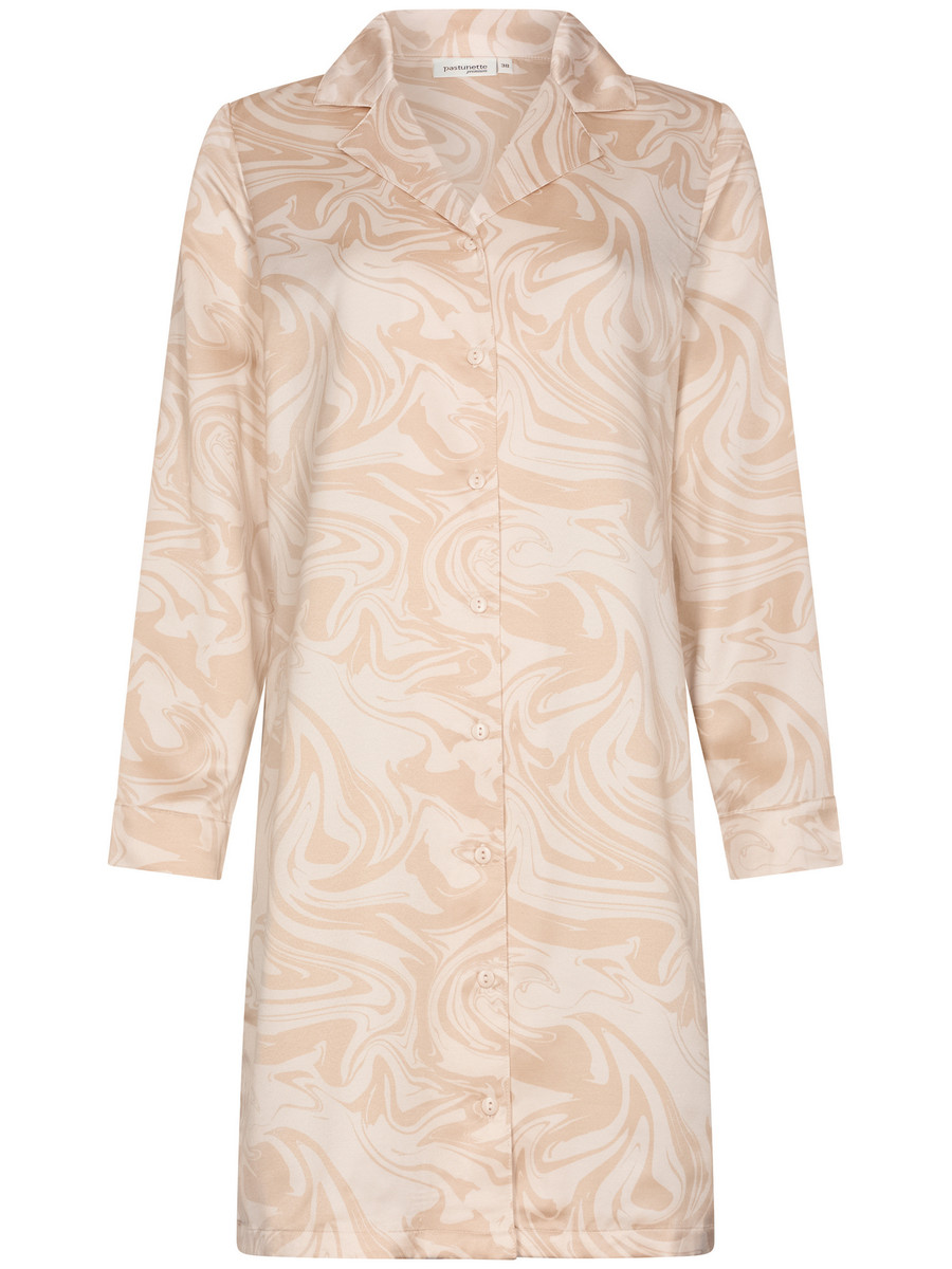 Een luxe satijnen doorknoopnachthemd van Pastunette uit de Premium collectie. Het nachthemd heeft lange mouwen en een reverskraag. De stof heeft een speelse organische print in de kleuren bleekoranje en wit. Het nachthemd is gemaakt van ‘cuddle’ satijn. Cuddle satijn is een stof dat langer meegaat en minder kreukelt dan andere satijnen stoffen.