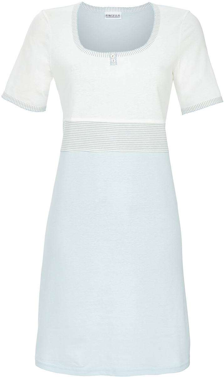 Een modern nachthemd van het merk Ringella. Het nachthemd heeft korte mouwen en een vierkante hals met een knoopje. De hals en mouwuiteinden zijn afgewerkt met een bies met een fijn strepenpatroon in de kleuren zachtblauw en gebroken wit. Dit strepenpatroon komt terug boven de taille. Boven de strepen is het nachthemd effen gebroken wit en onder de strepen zachtblauw van kleur.