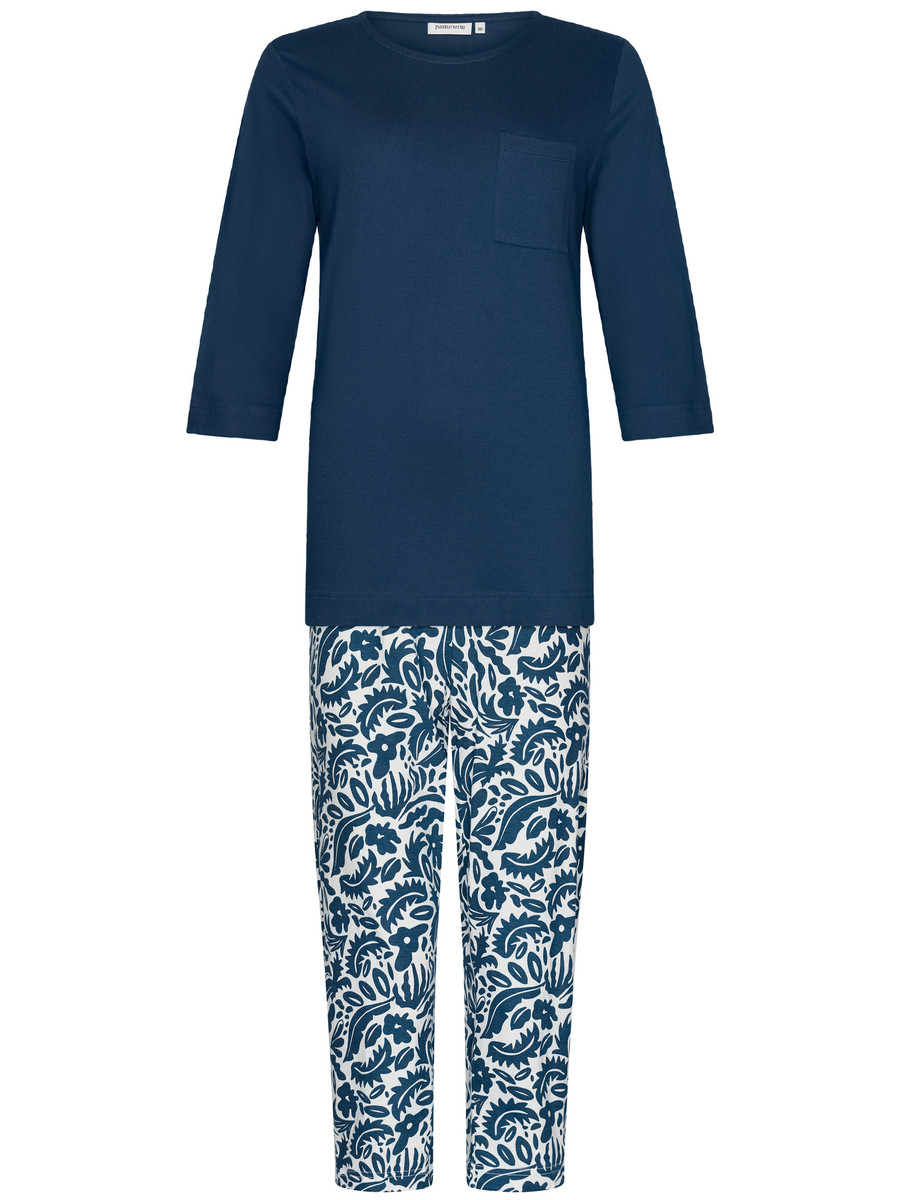 Een duurzame katoenen pyjama van het merk Pastunette. Het pyjamashirt heeft driekwart mouwen een ronde hals en een borstzakje. De stof is effen marineblauw van kleur. De driekwart broek heeft een marineblauwe organische floraprint op de witte achtergrond. De pyjama is gemaakt van organisch katoen.