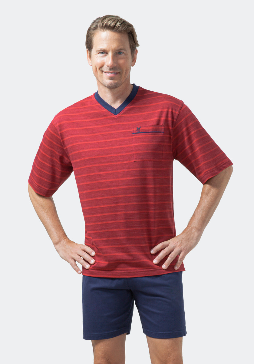 Een rode heren shortama van Hajo. Het pyjamashirt heeft een V-hals, een borstzakje en korte mouwen. De rode stof is gestreept. De donker blauwe short heeft zijzakken. De comfortabele stof heeft extra stevigheid en een zijdeachtige glans, doordat de katoendraden zijn gemerceriseerd.