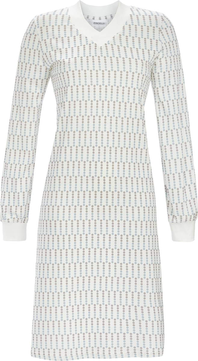 Een warm katoenen nachthemd van het merk Ringella. Het nachthemd heeft lange mouwen met boorden en V-hals. De stof heeft een minimalistische print van zachtroze en baby blauwe stippen op de champagnewitte achtergrond.