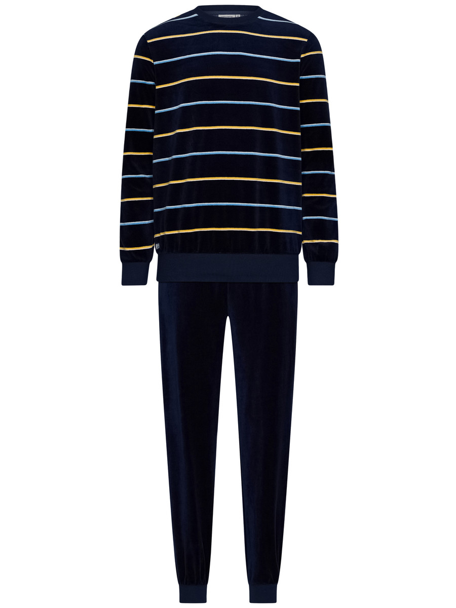 Een velours heren pyjama van het merk Pastunette. Het pyjamashirt heeft lange mouwen met boorden en een ronde hals. Ook de onderkant van het shirt is afgewerkt met een boord. De stof heeft een leuk strepenpatroon in de kleuren geel en lichtblauw op de nachtblauwe achtergrond. De lange broek is effen nachtblauw van kleur en heeft boorden aan de broekspijpuiteinden.