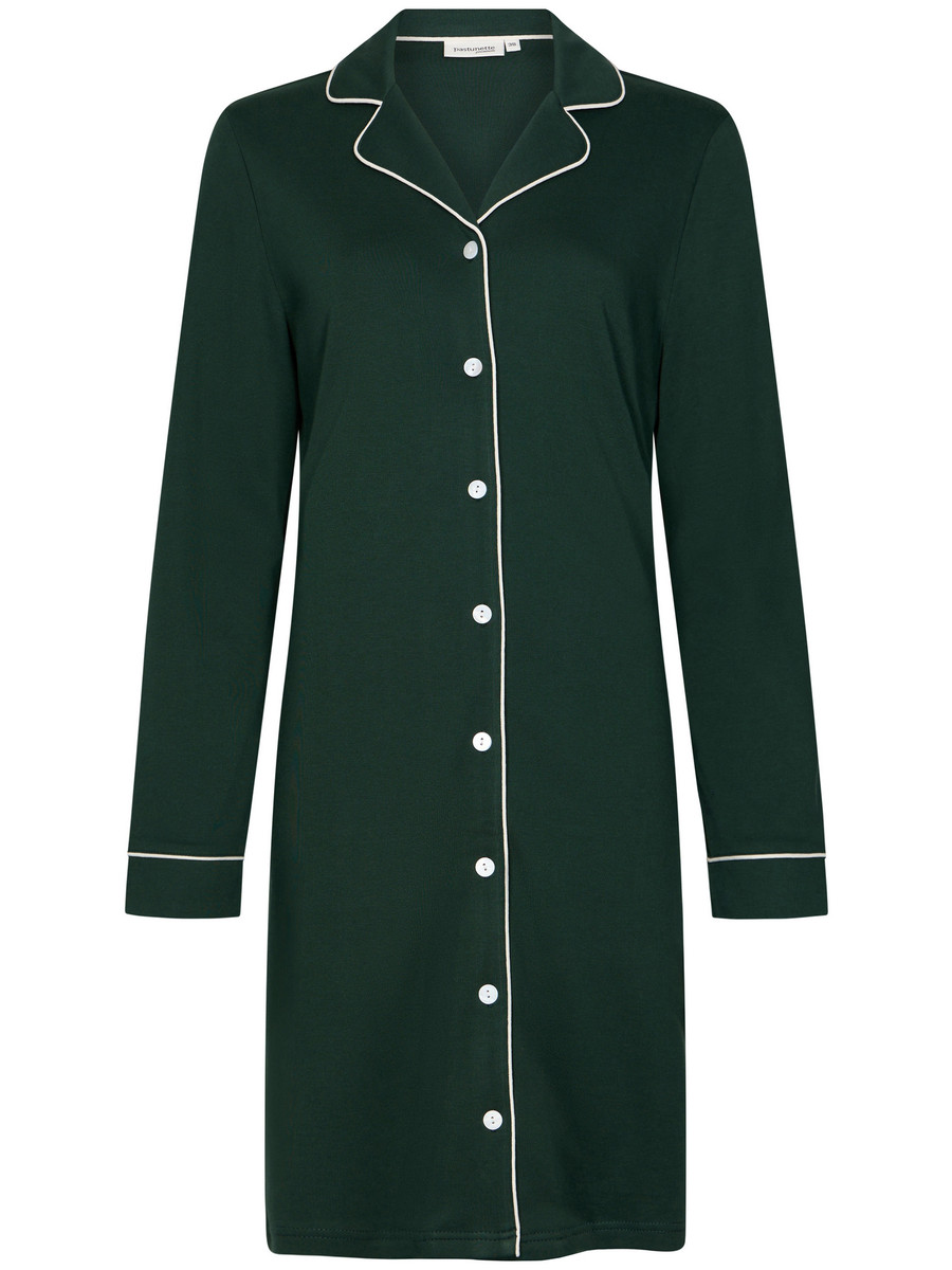 Een warm katoenen doorknoopnachthemd van Pastunette uit de Premium collectie. Het nachthemd heeft lange mouwen en een reverskraag. De mouwuiteinden, kraag en knoopsluiting zijn gedecoreerd met een fijne witte bies. Verder is het nachthemd effen dennengroen van kleur. Het nachthemd is gemaakt van 100% katoen interlock. Interlock is een gebreide katoen. Ook wel dubbel tricot genoemd, omdat twee lagen samen gebreid worden. Het is dan ook een heerlijk warme stof voor de koude wintermaanden.