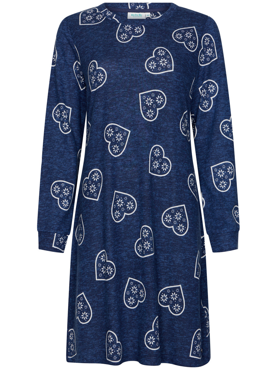 Een duurzaam zachte perzikfleece nachthemd van het merk Rebelle. Het nachthemd heeft lange mouwen met boorden en een ronde hals. De stof heeft een leuke print van witte harten met daarin ijskristallen op de nachtblauwe achtergrond. Het nachthemd heeft een fijne zachte en warme stof die op zo’n manier is behandeld waardoor het kleine zachte haartjes heeft, vergelijkbaar met een perzik. Het nachthemd is gedeeltelijk gemaakt van gerecyclede materialen.