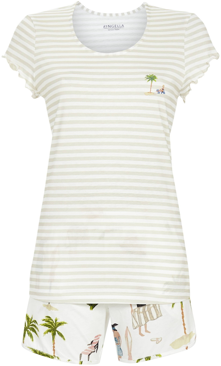 Een zomerse shortama van het merk Ringella. Het shirt heeft een ronde hals en korte mouwen. De mouwuiteinden zijn afgewerkt met een dubbele rolzoom. Op de borst staat een kleurrijke zomerse print van een vrouw onder een palmboom. Verder heeft het shirt een klassiek strepenpatroon in de kleuren beige en wit. De korte broek beschikt over praktische zakken en heeft een terugkerend kleurrijk zomers patroon van onder andere strandgangers, palmbomen en parasols op de witte achtergrond.
